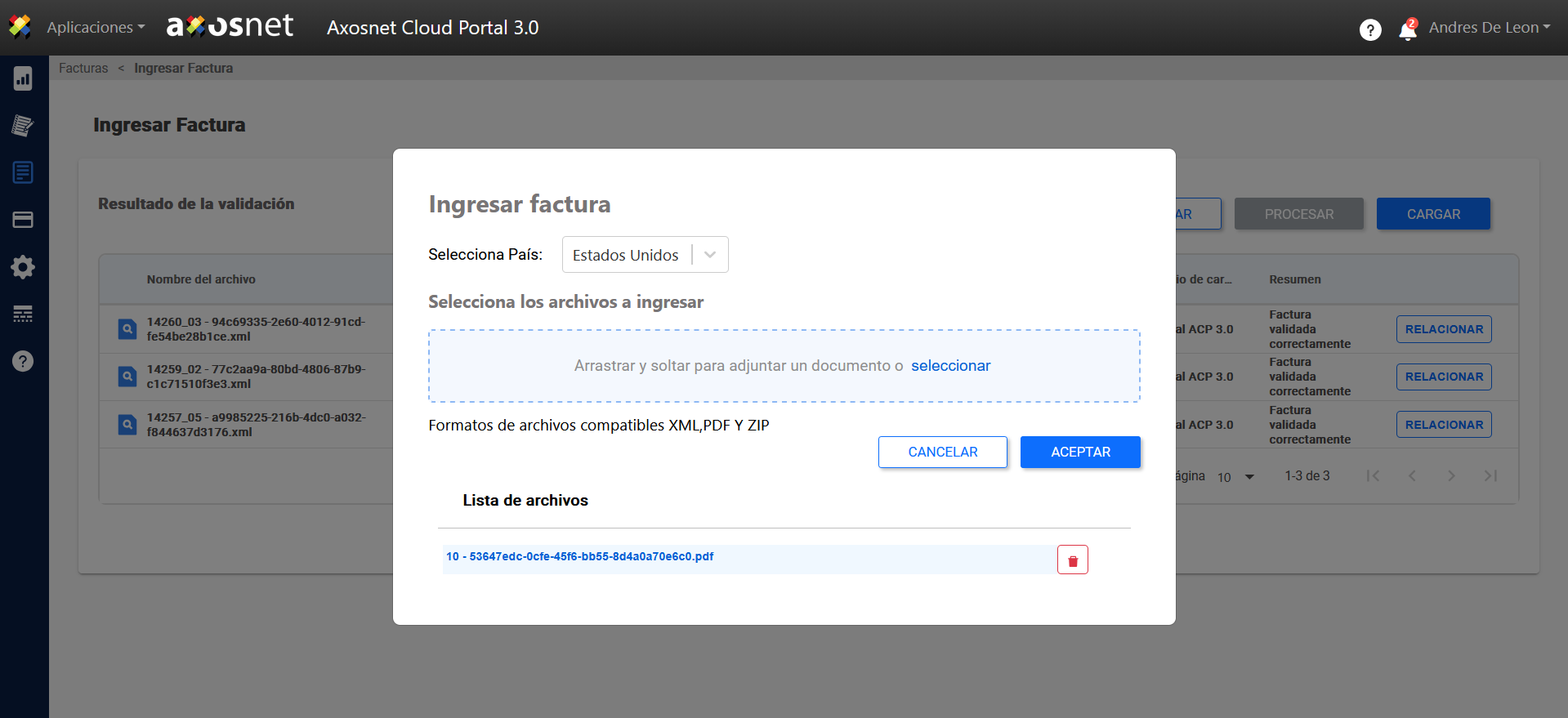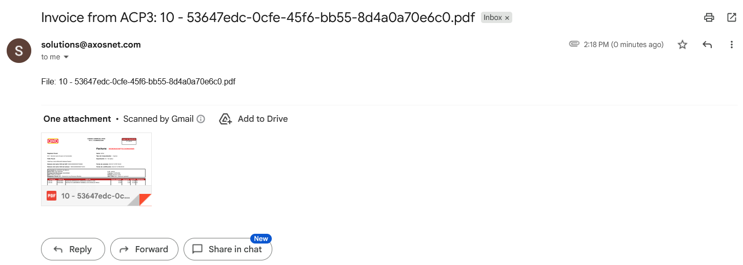 Esta funcionalidad le permitirá recibir en su correo electrónico las facturas en formato PDF que han sido cargadas y procesadas a través de Axosnet Cloud Portal (ACP).