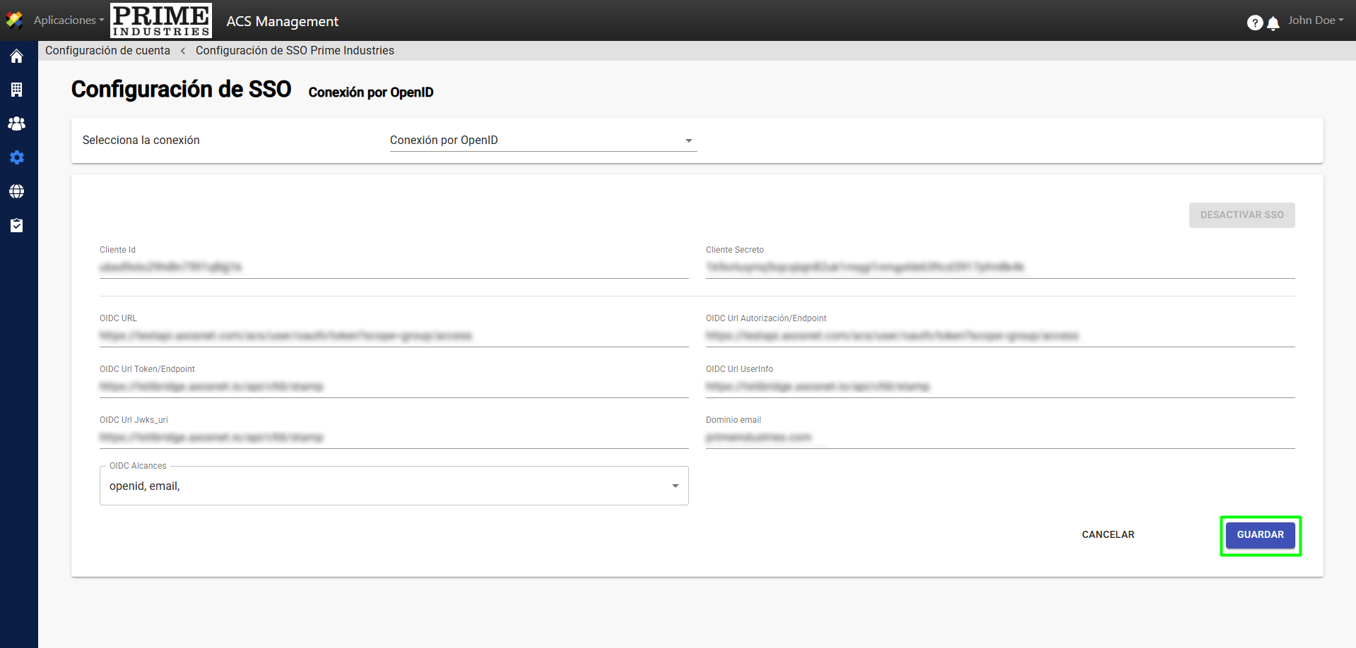 5. Configure la conexión SSO con la información proporcionada por su proveedor de autenticación y complete los siguientes campos: