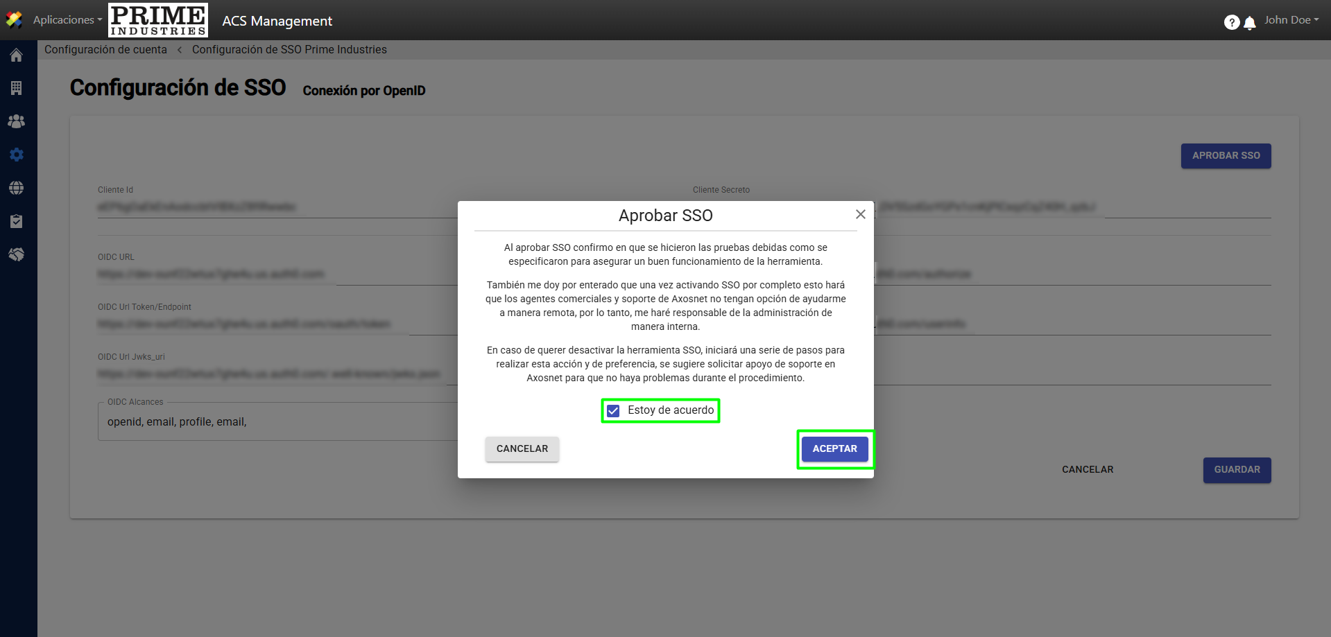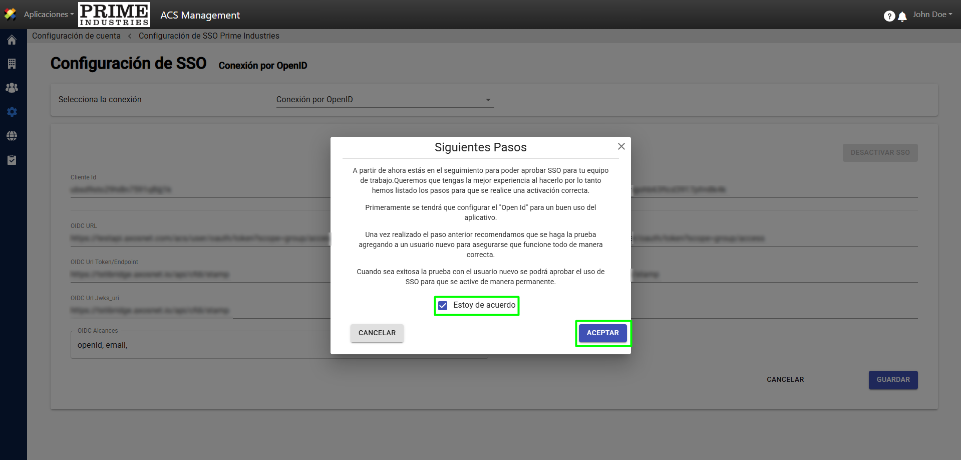 4. Mostrará un mensaje de “Aprobar SSO”. A continuación, lea y marque la casilla “Estoy de Acuerdo”. Luego haga clic en “Aceptar” para continuar.