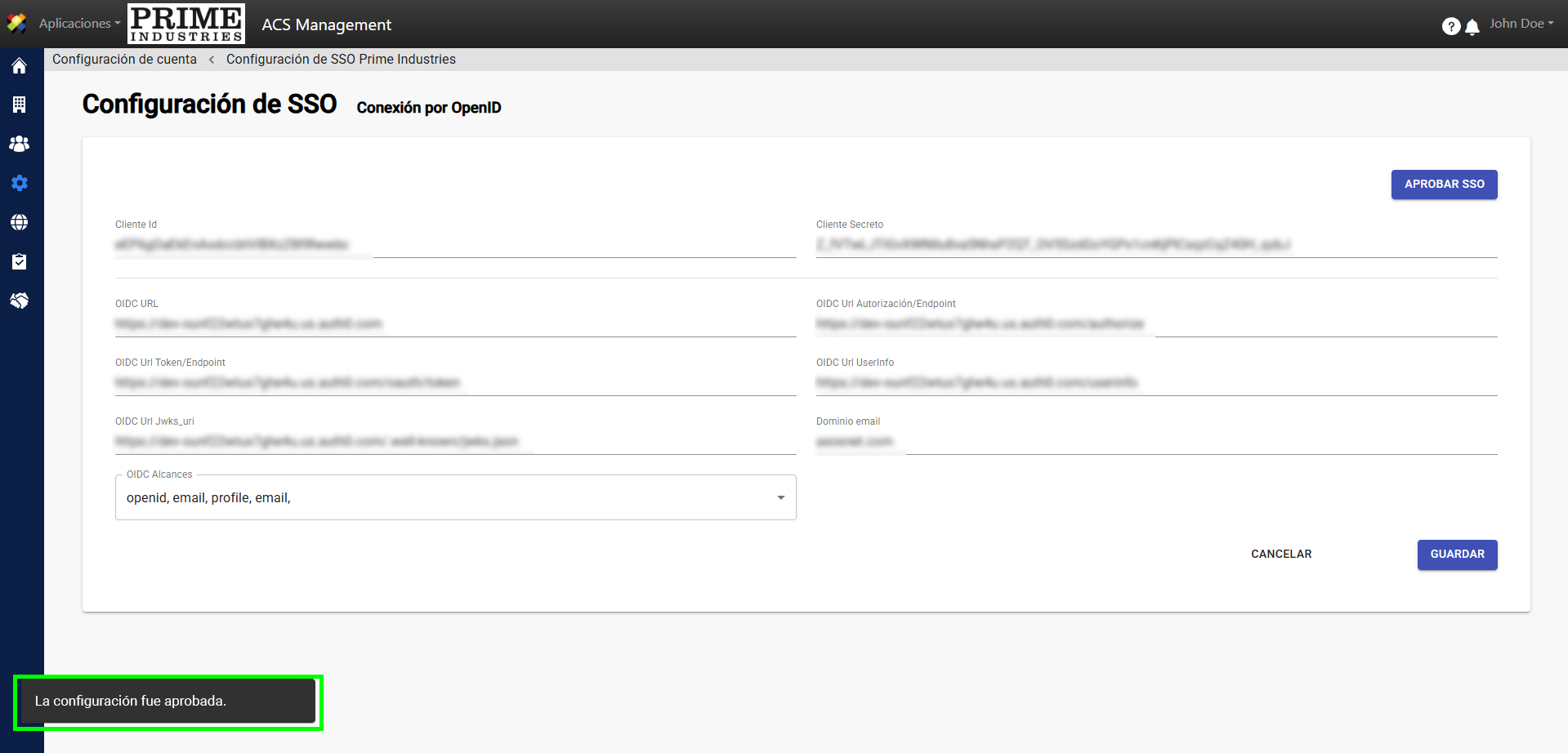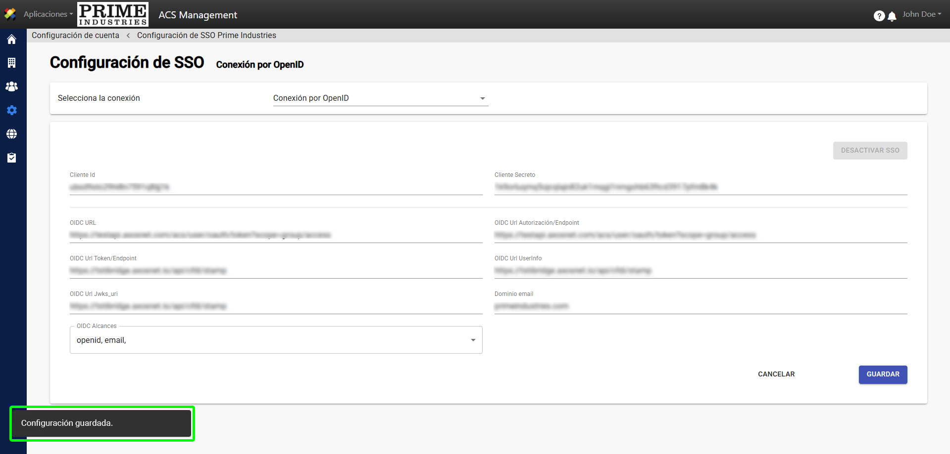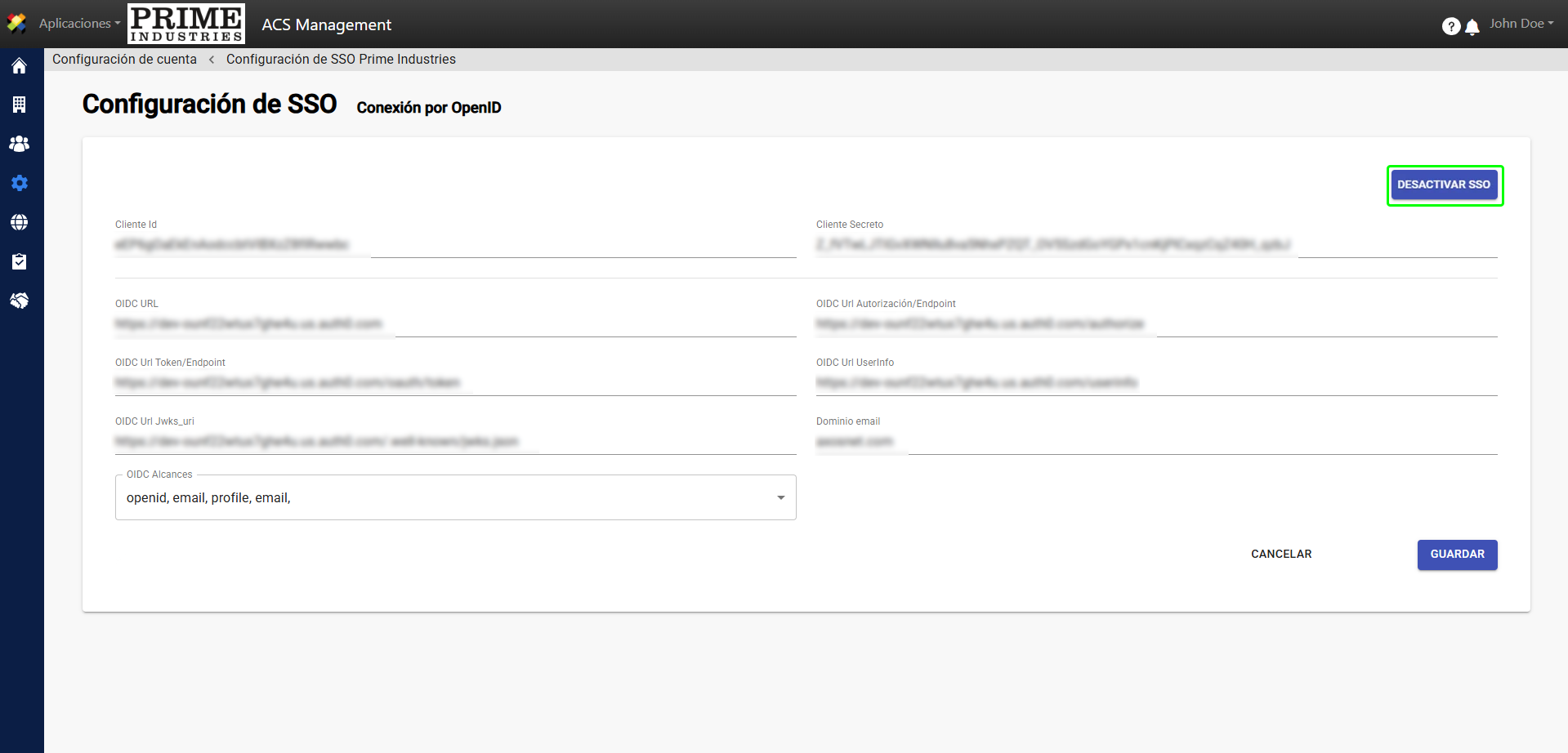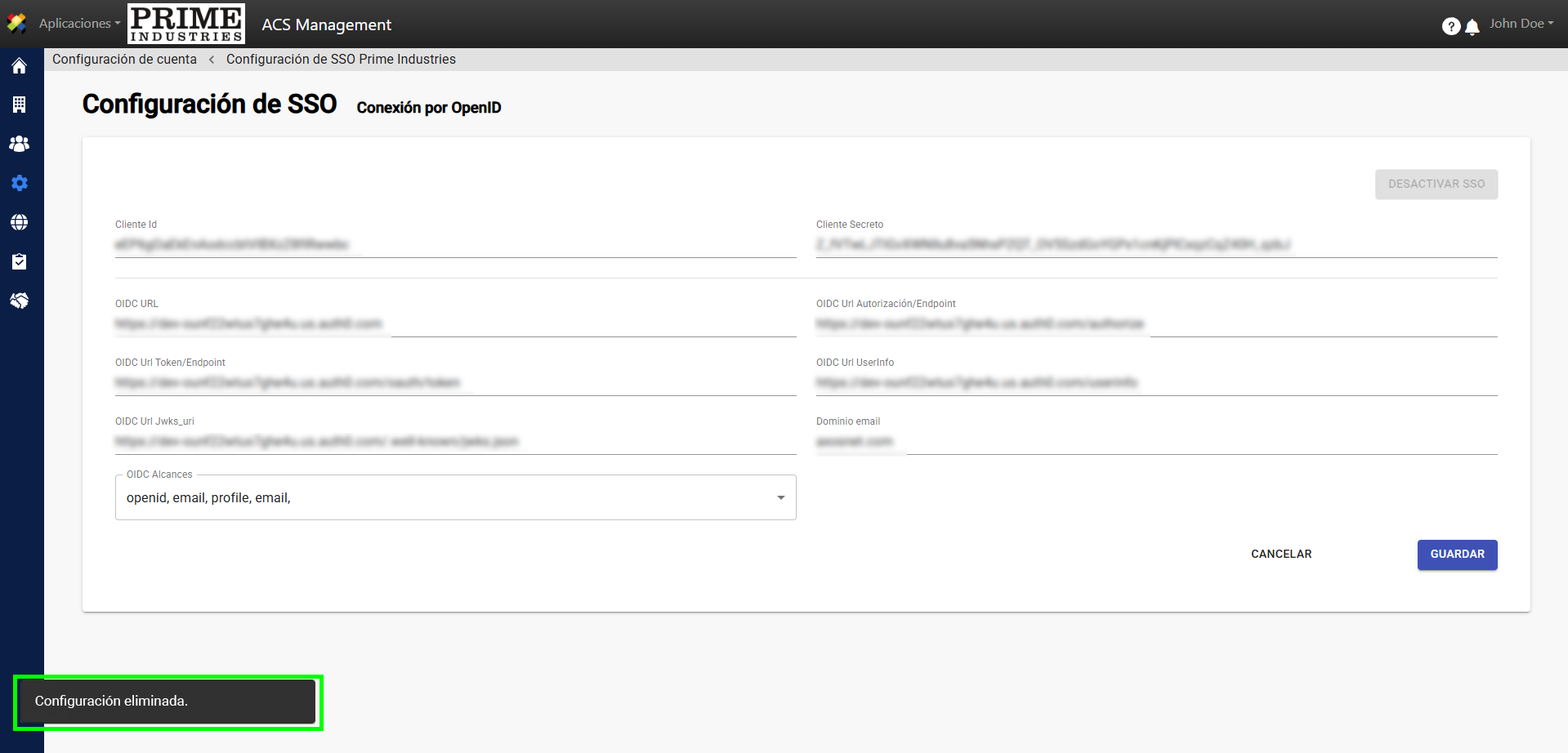 5. A continuación, se mostrará la pantalla “Configuración SSO” como si no hubiera una configuración previa.