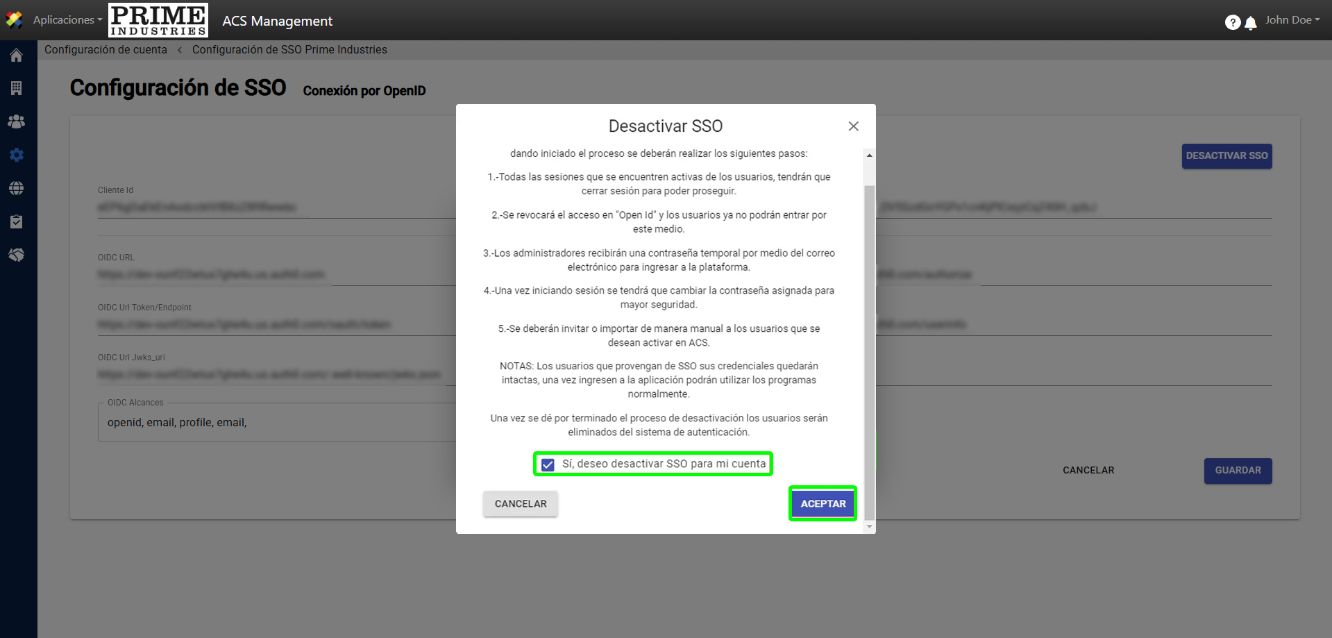 4. Aparecerá el mensaje “Desactivar SSO”, marque la casilla “Si, deseo desactivar SS para mi cuenta” y luego haga clic en el botón “Aceptar” para continuar.
