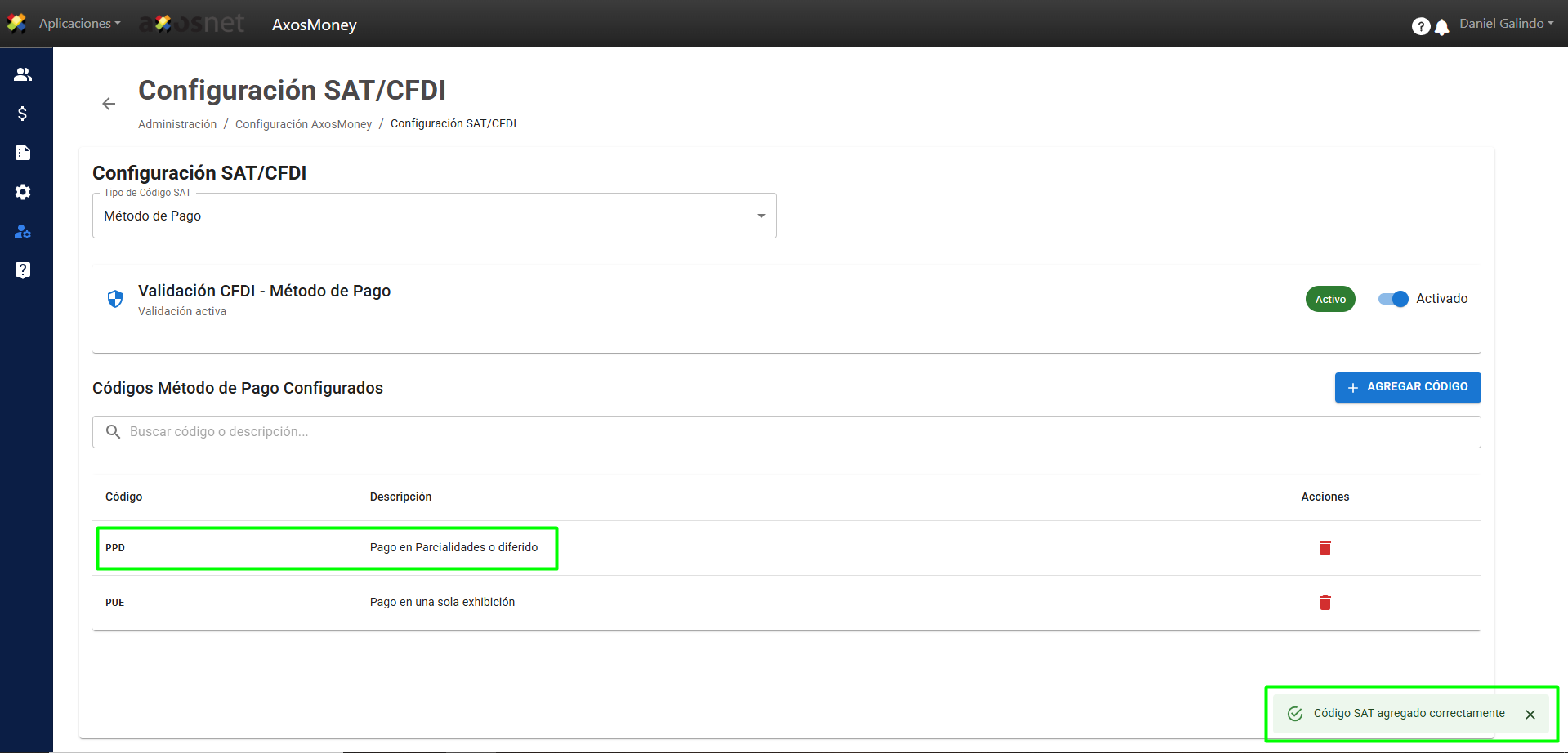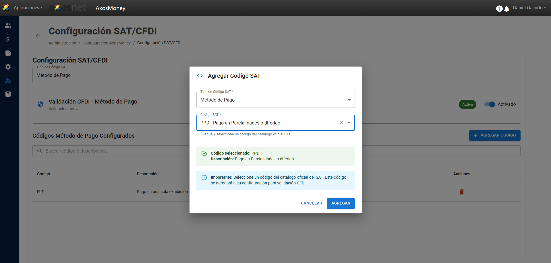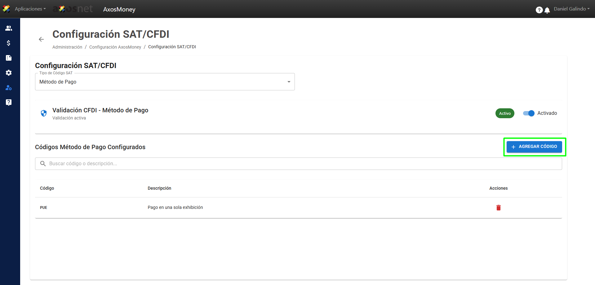 3. En el dropdown Tipo de Código SAT, seleccione la opción Método de Pago y haga clic en Agregar Código.