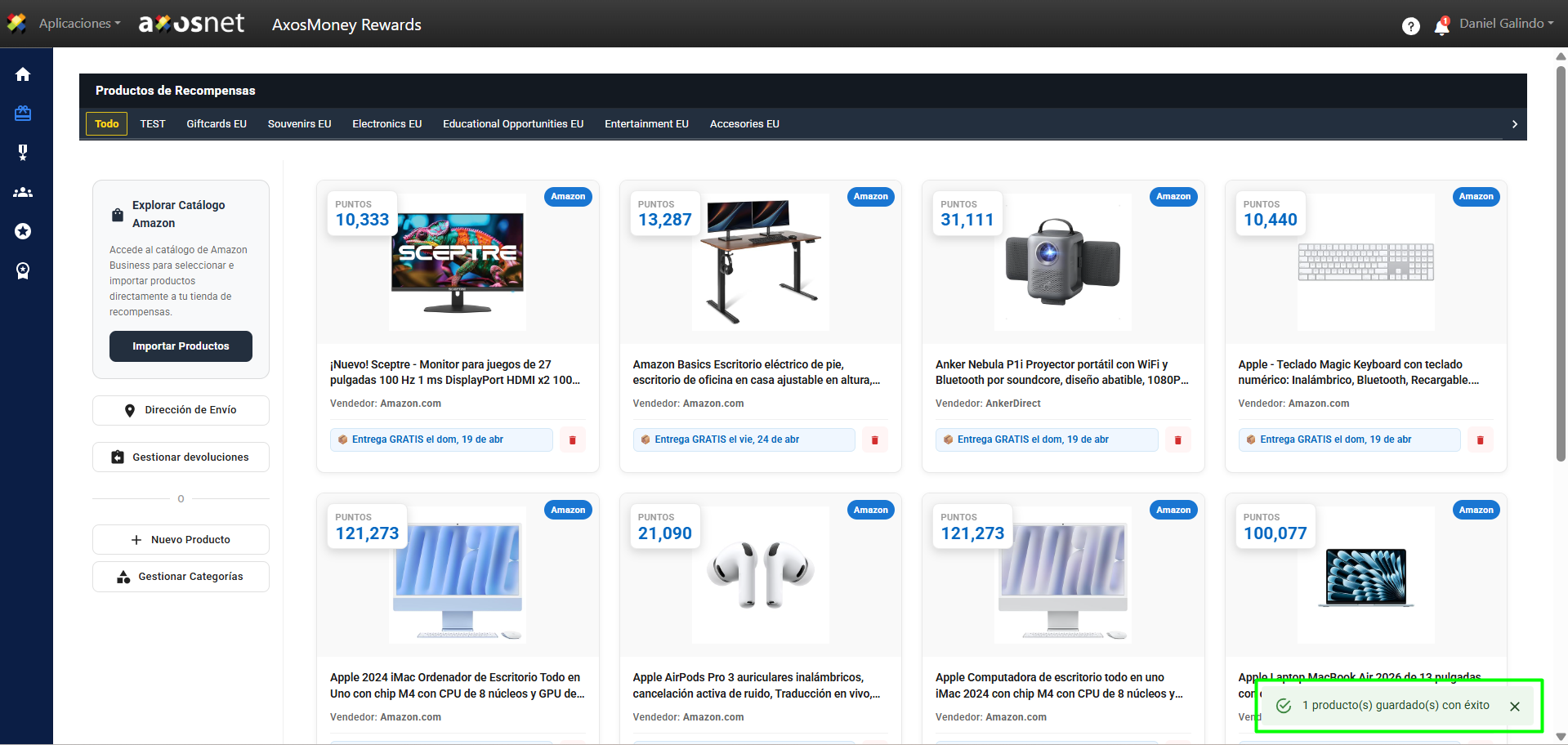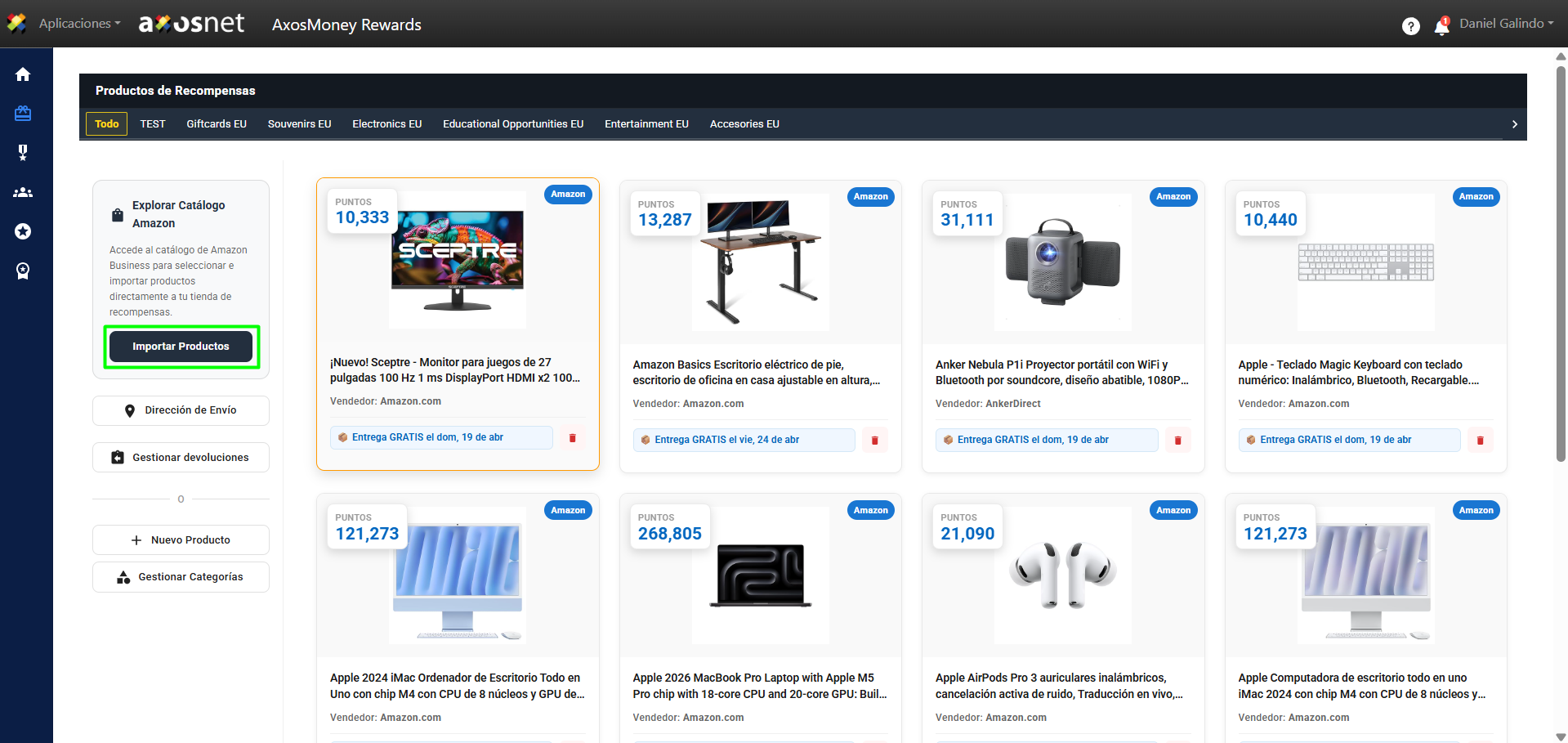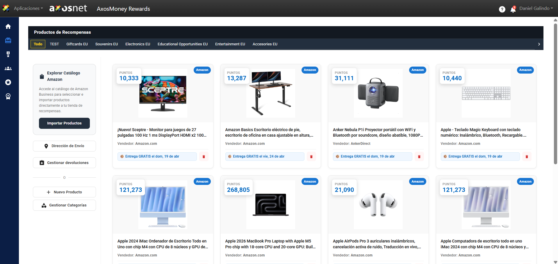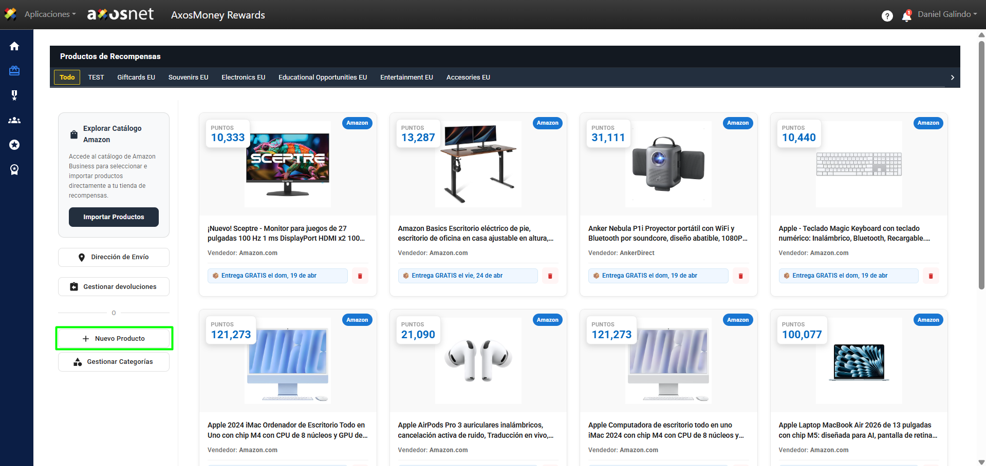 En esta sección de AxosMoney Rewards solo el Administrador podrá gestionar los productos que pueden ser canjeados como recompensas por los colaboradores. Estos productos pueden ser importados desde una lista de Amazon Business o se pueden cargar productos manualmente.