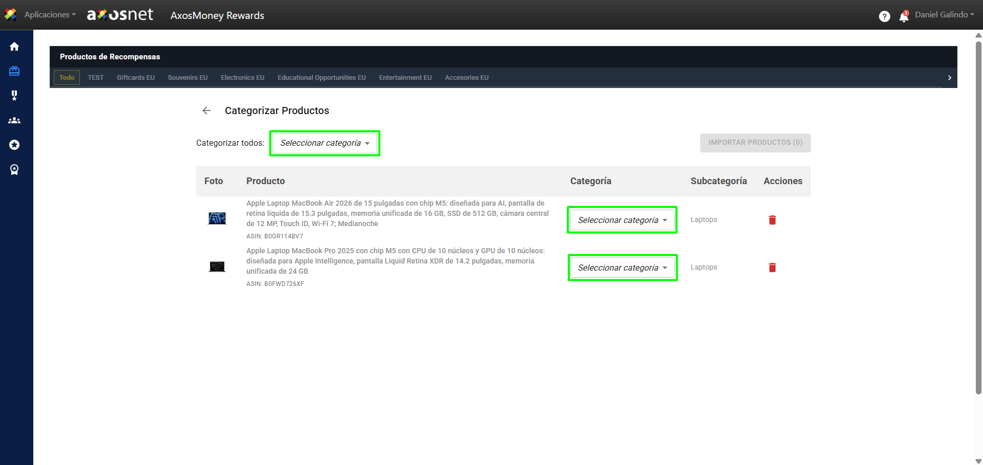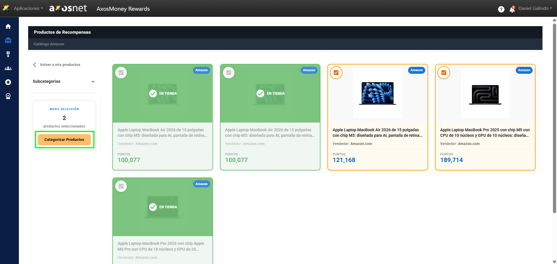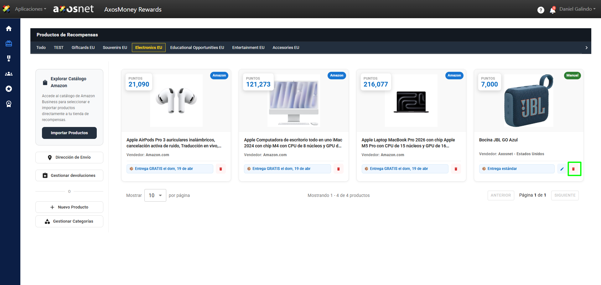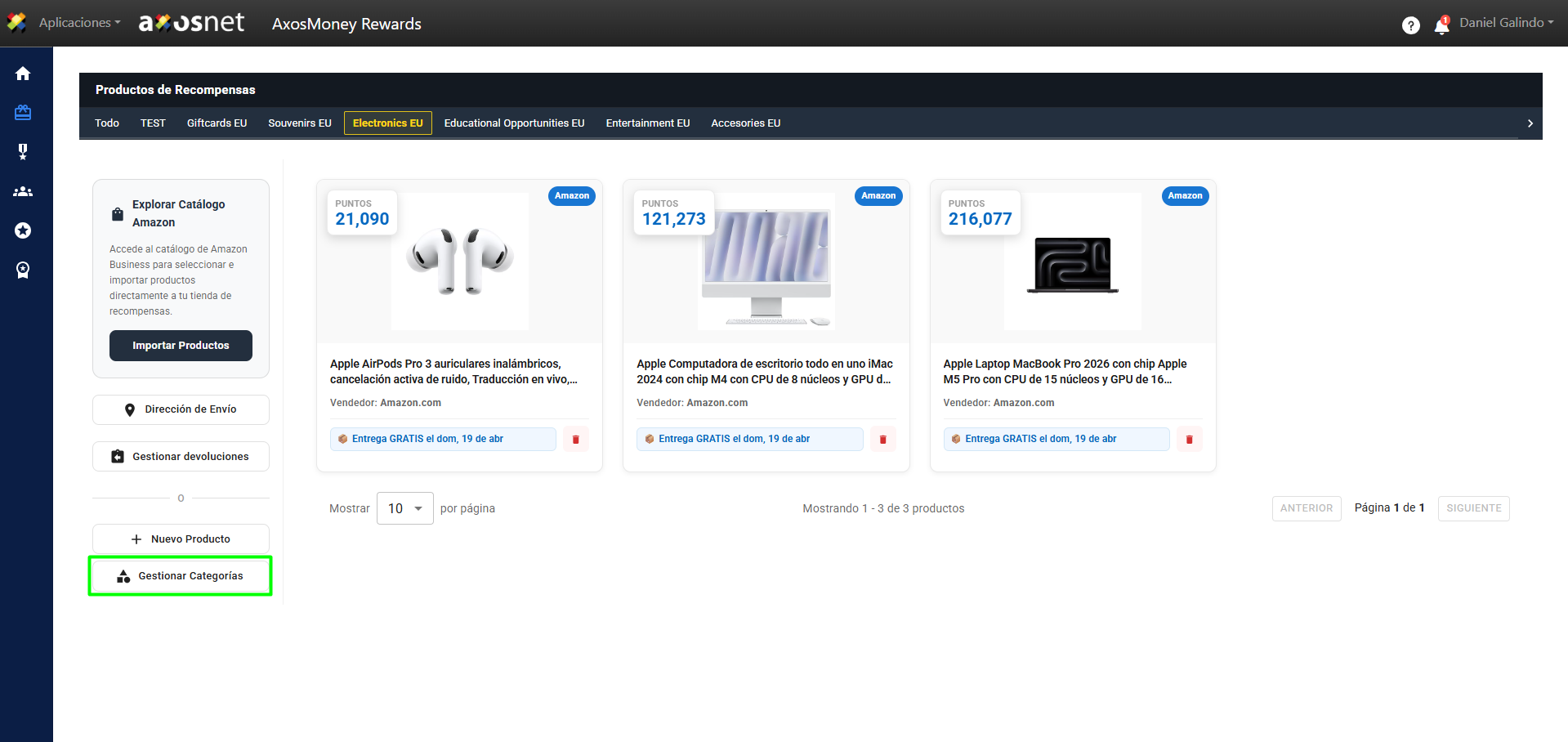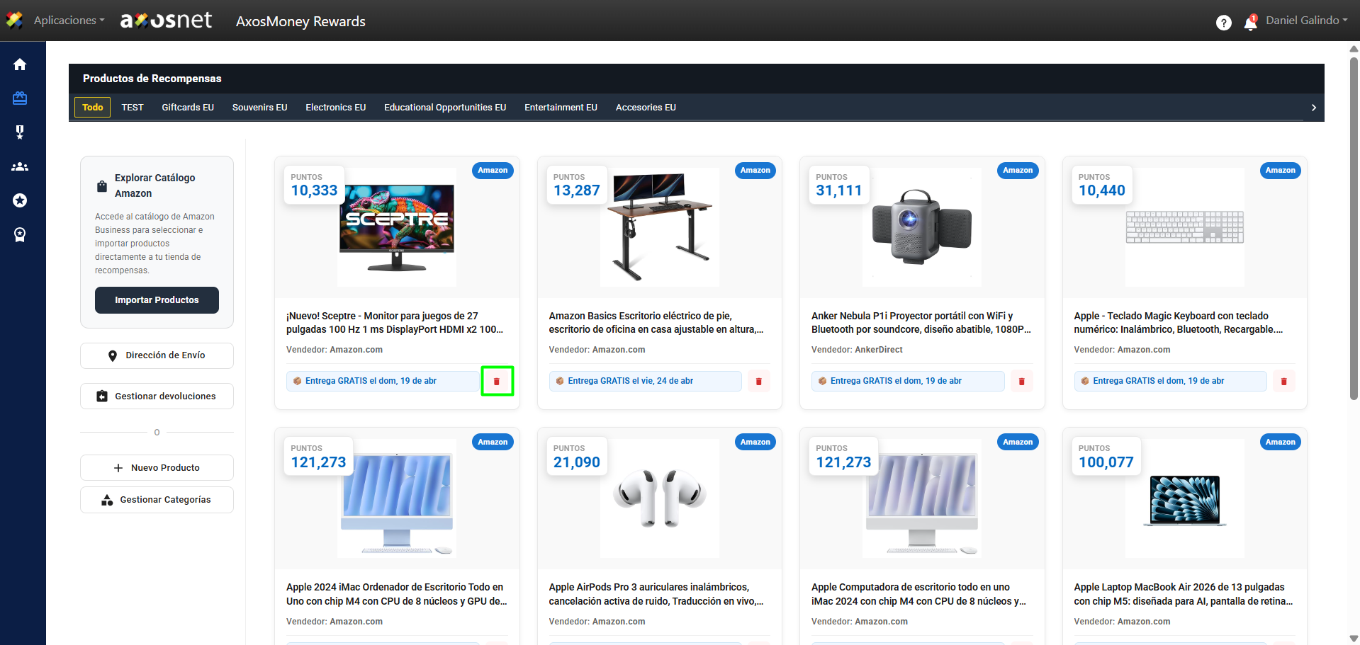 En esta sección de AxosMoney Rewards solo el Administrador podrá gestionar los productos que pueden ser canjeados como recompensas por los colaboradores. Estos productos pueden ser importados desde una lista de Amazon Business o se pueden cargar productos manualmente.