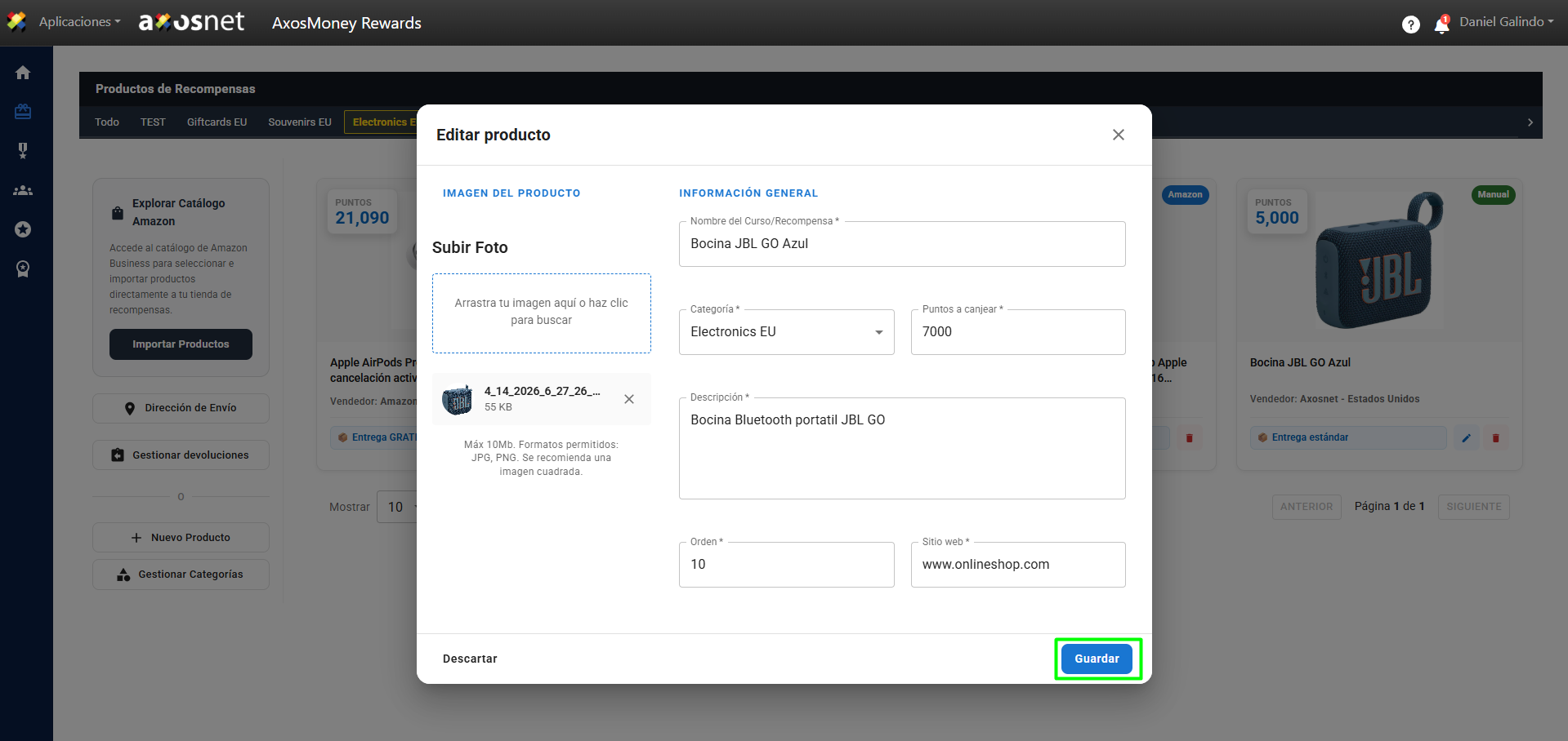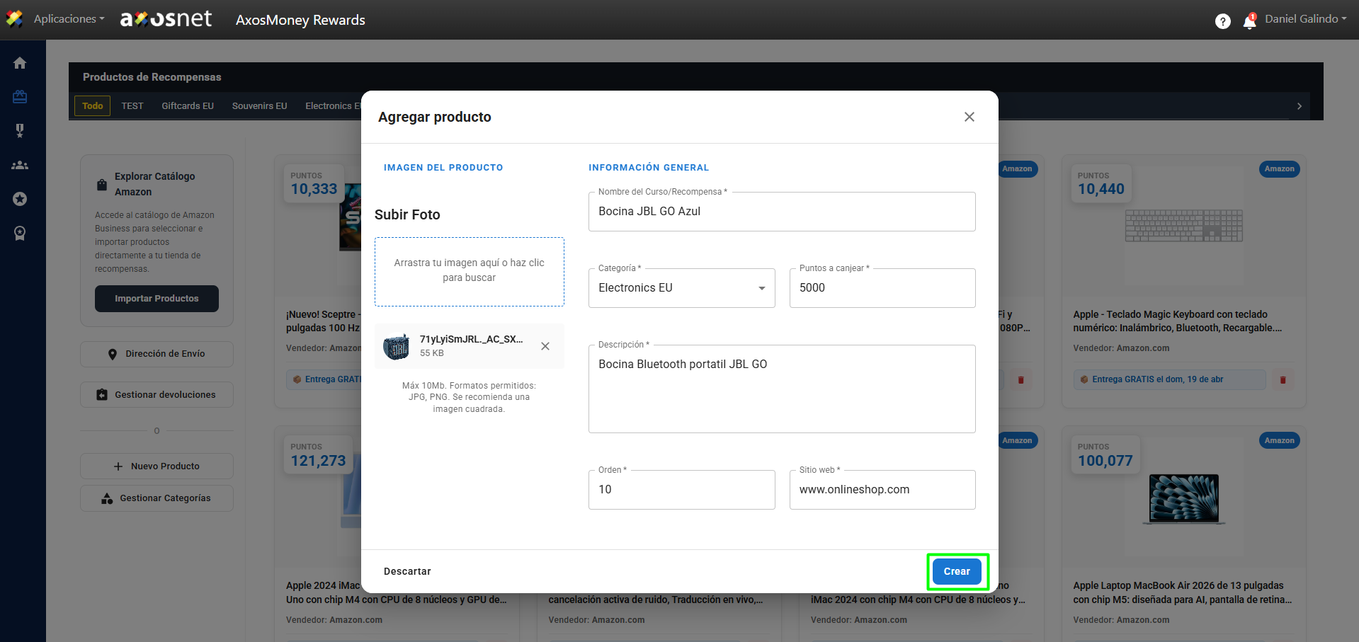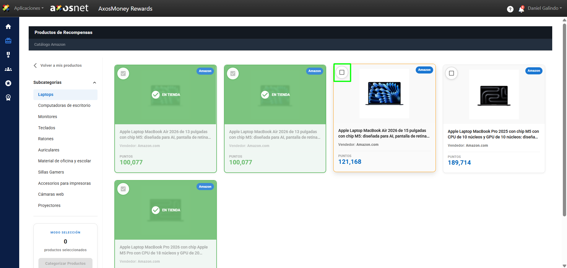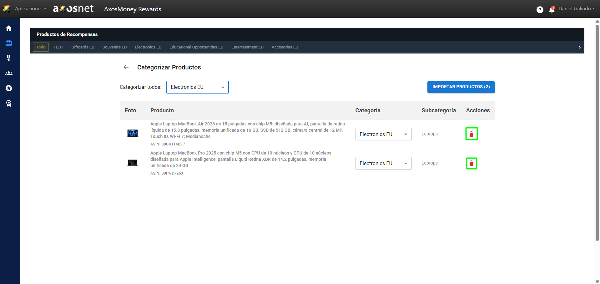 En esta sección de AxosMoney Rewards solo el Administrador podrá gestionar los productos que pueden ser canjeados como recompensas por los colaboradores. Estos productos pueden ser importados desde una lista de Amazon Business o se pueden cargar productos manualmente.