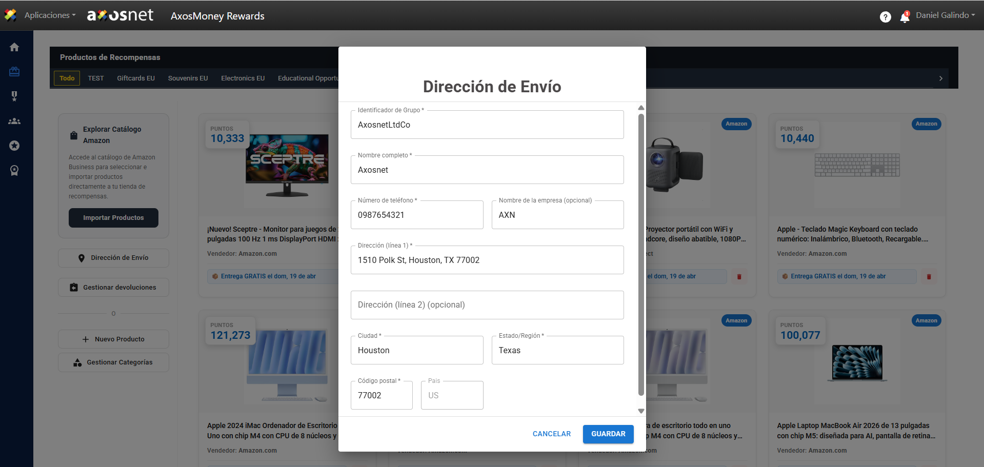 Nota: Al momento de canjear un producto, el colaborador verá la dirección predeterminada que el administrador registró en esta sección. Sin embargo, el colaborador tiene la opción de modificar dicha dirección para que Amazon envíe el producto directamente a su domicilio.