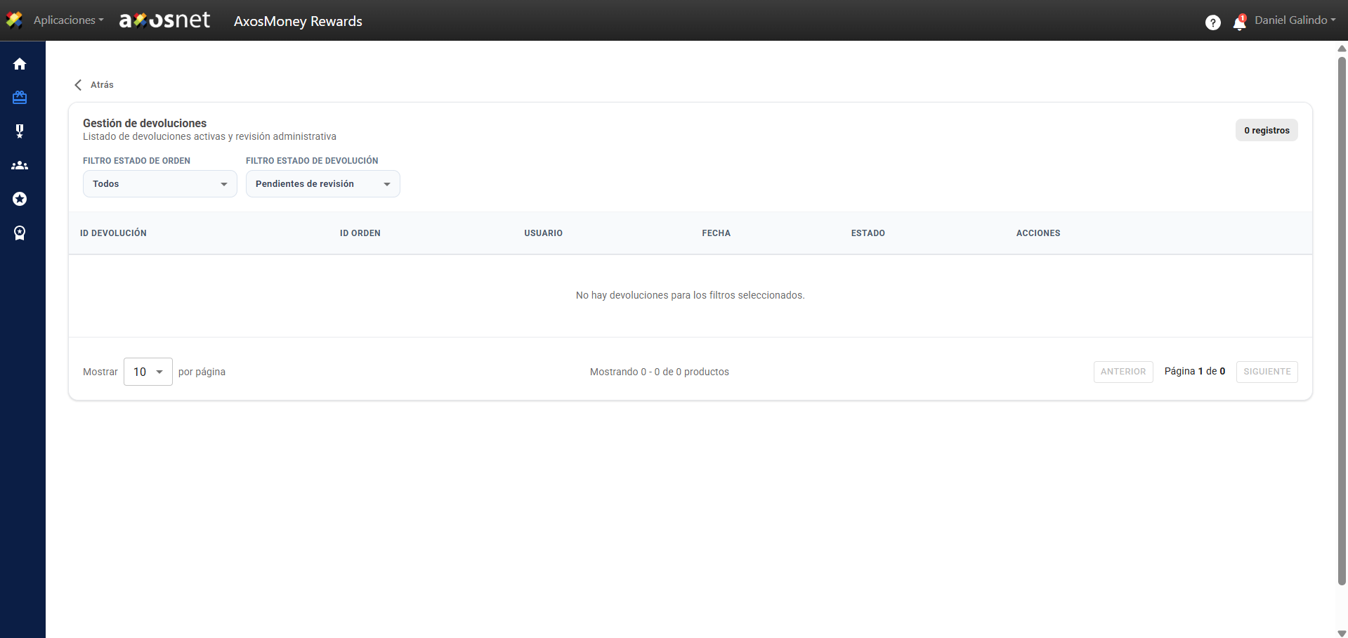 En esta sección podrá gestionar y ver el estatus de las devoluciones de los productos que sean canjeados como recompensas por los colaboradores.