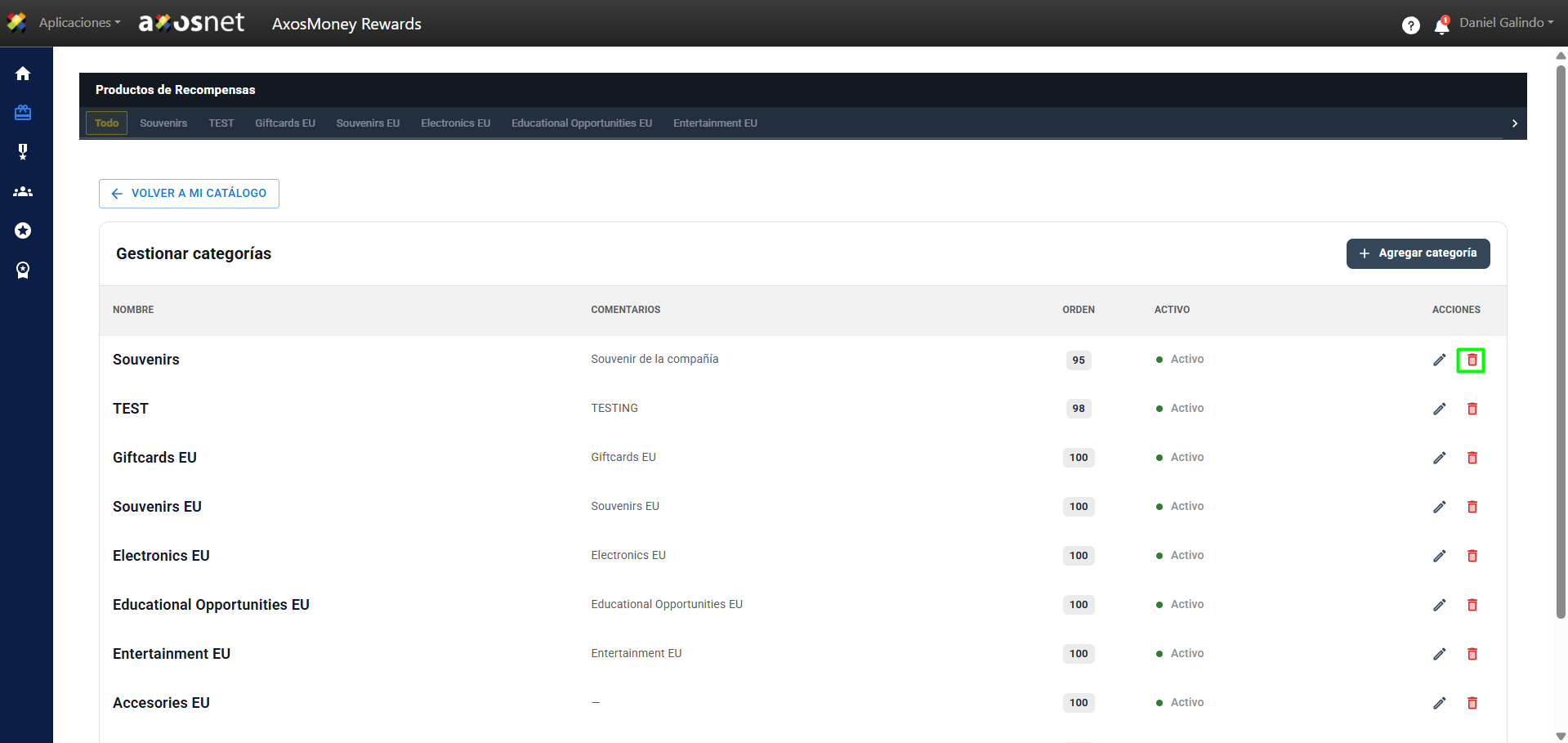 6. Puede eliminar la categoría haciendo clic en el icono del bote de basura. Aparecerá un mensaje para confirmar que el producto ha sido eliminado.