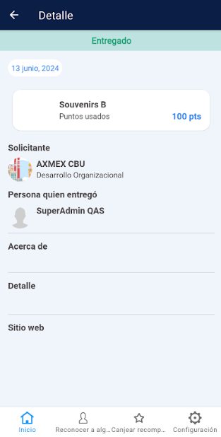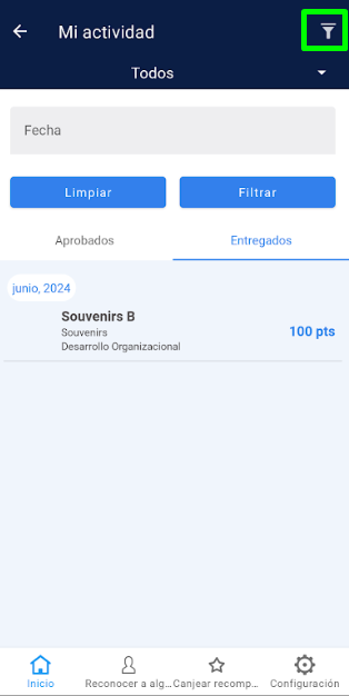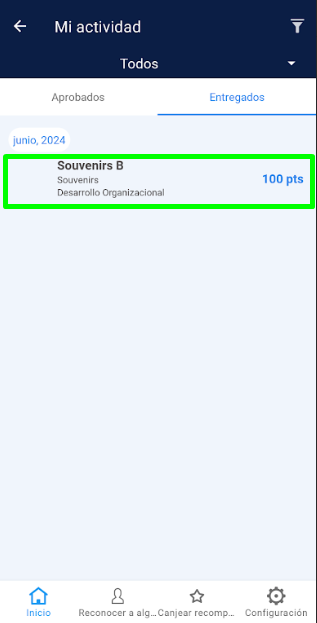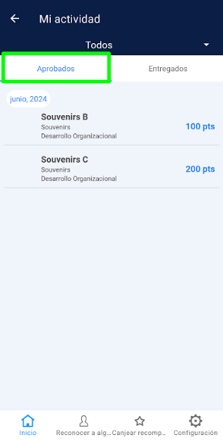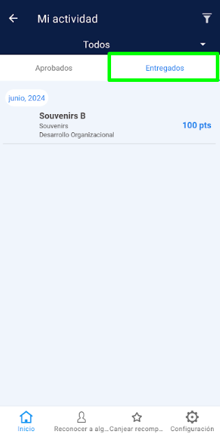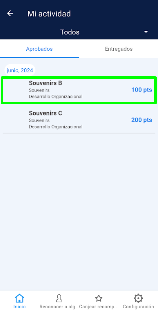 Este apartado muestra las recompensas canjeadas que están en estatus “Aprobados” y “Entregados”.