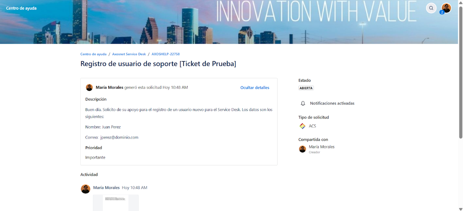 3. Si desea obtener más información o responder al ticket, haga clic en la referencia y se mostrará toda la información sobre las respuestas enviadas por el equipo de soporte.