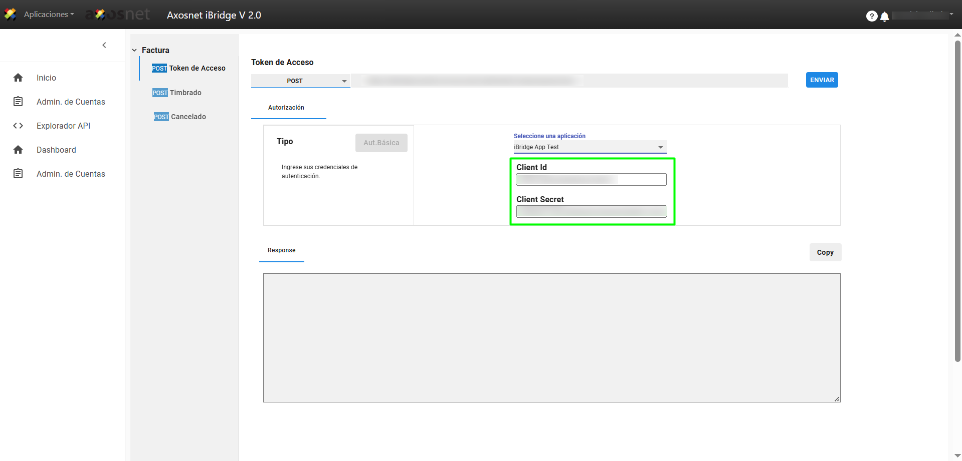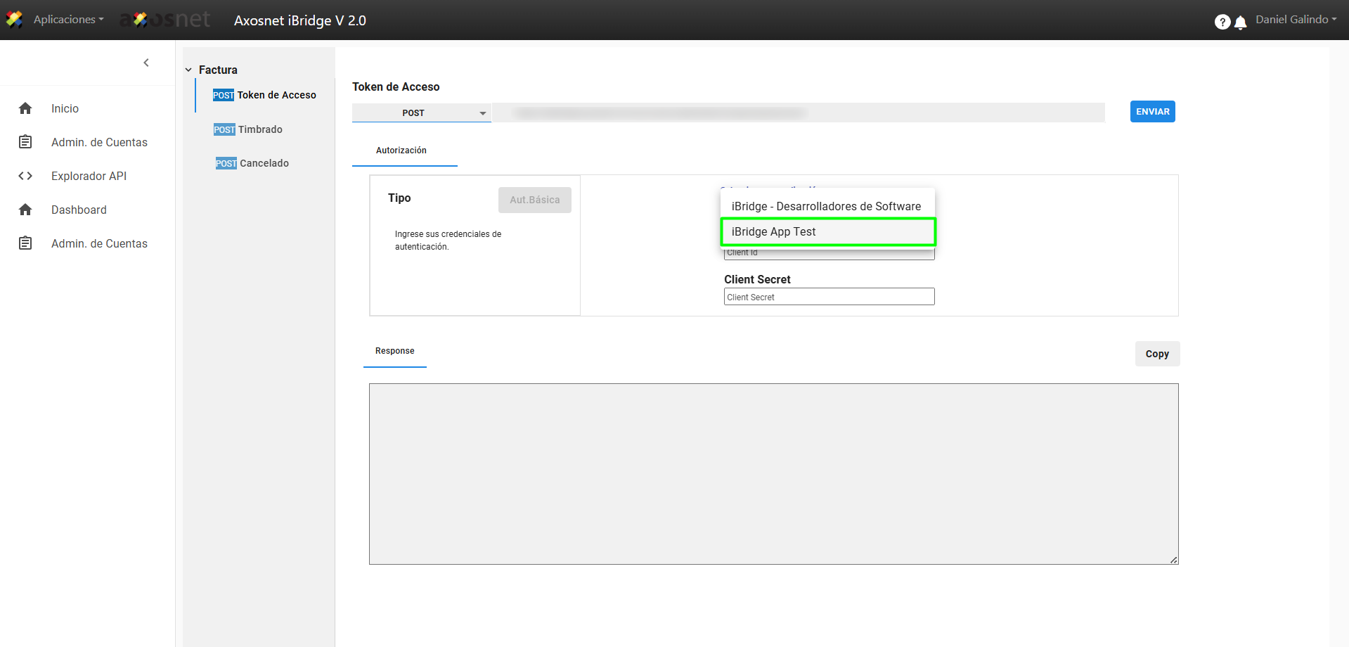 4. Al seleccionar la aplicación cargará el Client ID y Client Secret que se generó al momento de crearla.