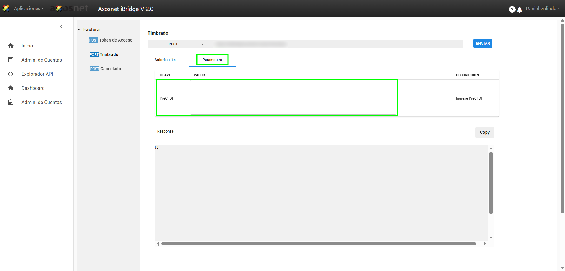 7. Después seleccione la pestaña de Parámetros e ingrese el Pre CFDI.