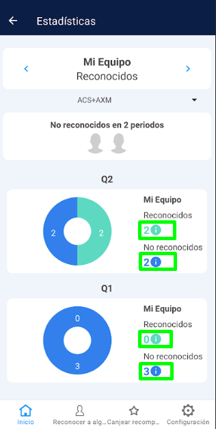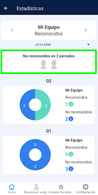 b) Gráficas de dos periodos: Por medio de gráficas podrá visualizar el número de colaboradores que en 2 periodos (trimestres) han tenido actividad, ya sea reconocidos o no reconocidos.