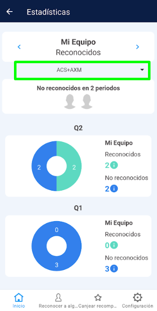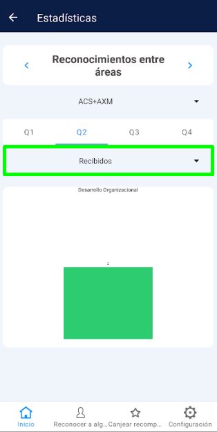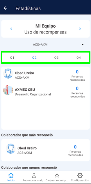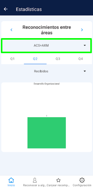 3. En el apartado “Reconocimiento entre áreas” en el menú horizontal seleccione el periodo (Q1, Q2, Q3, Q4) que desea visualizar, donde podrá seleccionar del menú los siguiente elementos:
